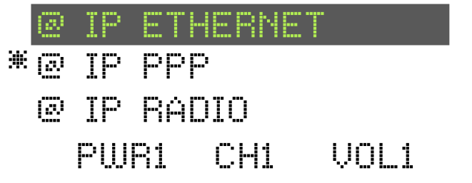Druk op [^ v - toetsen] totdat @ IP ETHERNET is geselecteerd.